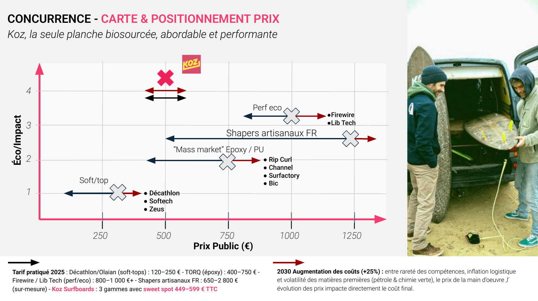 KOZ est née d’une ambition : réinventer la planche de surf à partir de matières naturelles et de procédés responsables. Le marché français compte plus d’un million de pratiquants et 250 000 planches vendues par an. La majorité est importée d’Asie, avec un fort impact environnemental.